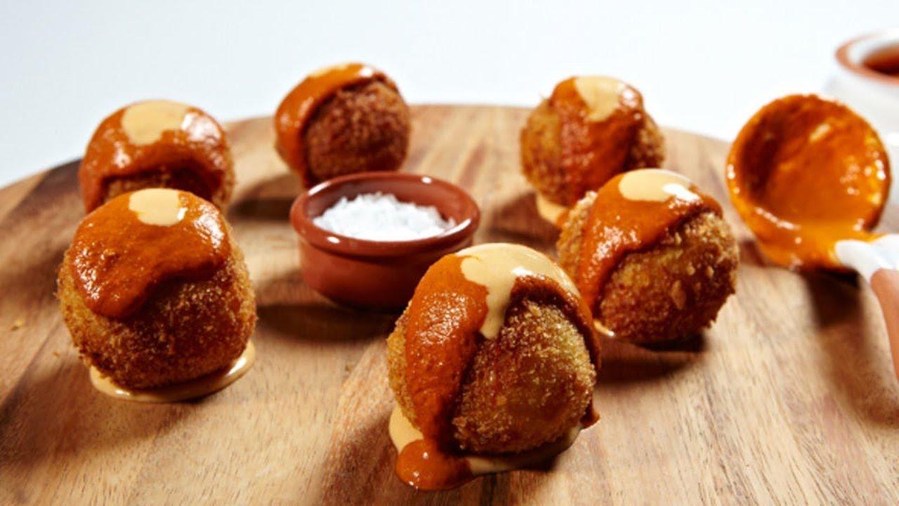 Això és la bomba! La tapa més famosa de Barcelona del barri mariner, la Barceloneta. Una bola de patata farcida de carn amb salsa brava. Per llepar-se els dits.